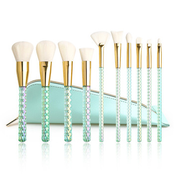 Marque privée Lot de 10 pinceaux de maquillage irisés avec poignées en cristal avec étui à fermeture éclair vert menthe pour le maquillage du visage et des yeux